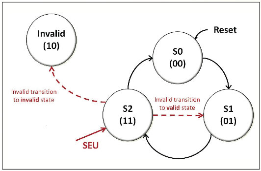 - Safer FSMs for protection against single bit flips of storage elements, known as single event upsets (SEUs), which can occur regardless of the FSM encoding scheme. The protection can be in the form of detection of, and recovery from, an SEU, or it can be complete correction where an SEU will not disturb the state machine’s operation.