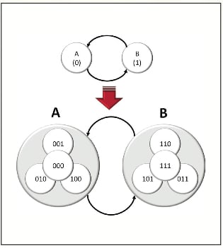 Alternatively, the new synthesis technology can implement an SEU correcting FSM, where an SEU does not interrupt the normal FSM operation. The impact on device area is greater with this scheme. However, the increase is logarithmically related to the FSM size, so the impact lessens for larger state machines. A simple two-state SEU correcting FSM is shown in Figure 4.