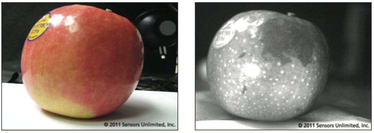 SWIR imaging has many interesting applications in the fields of food & beverage inspection, silicon wafer process monitoring, and surveillance for the defense industry. SWIR imaging can reveal bruises on apples not readily apparent to human visual inspection (Figure 1).