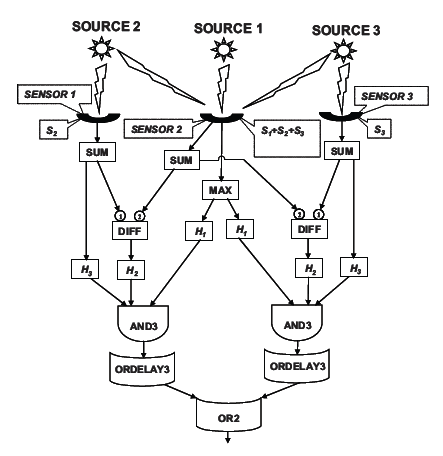 The DL consists of three input channels, each with a sensor attached. The sensors receive signals from sources one, two, and three. Only measurements from the central source are of interest. Due to the geometry of the sources and properties of the sensors, only sensor two can receive emissions from the central source that are significant. Unfortunately, sensor two’s measurement may be corrupted by emissions from the other two sources. The digital logic is constructed so that if there were significant corruption of sensor two’s measurements, then the final OR-gate returns unity, so the measurements can be ignored.