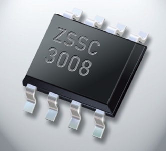 The ZSSC3008’s standard supply voltage is 2.7 to 5.5V, or up to 30V with external JFET. Accuracy is 0.25% over the -25 to +85°C range, and 0.5 % from -40 to +125°C. Depending upon configuration, current consumption typically ranges from 1mA down to 250μA. Response time is typically 1ms.