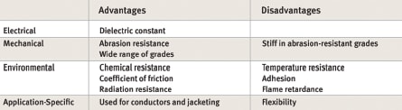Polyethylene is most appropriate as a dielectric for conductors because polyethylene jackets tend to be stiff, which affects the flexibility of the cable. Polyethylene has good dielectric constant properties when used in conjunction with foam. Mechanically, high-molecular-weight polyethylene is abrasion-resistant and low-friction, but it is also stiff when compared to other materials. Like polyurethane, polyethylene’s temperature range is rather limited, and it is difficult to bond chemical boots to polyethylene cable jackets. Overall, the mechanical properties of polyethylene are reduced by flame-retardant treatments.