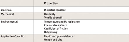 Silicone is primarily used as a cable jacket and is very flexible even at low temperatures. However, it cuts easily, and its sticky surface results in a high coefficient of friction, so it is not good for cleanroom environments. Silicone’s tensile strength and tear resistance are low, therefore requiring it to be thicker as compared to other jacket materials. Some surface treatments are available to reduce the coefficient of friction, but these tend to wear off over time. Silicone has very good radiation resistance, but the grades of silicone used for cable jackets are known to outgas silicone oil in vacuum applications such as a thermal vacuum chamber. If weight is an issue, silicone is not the optimal choice. If flexibility is important and weight is not a factor, silicone is a good choice. However, it is more labor-intensive to gain access to the conductors, which results in higher costs for termination.