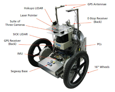 The robot is designed to mount various sensors, electrical components, two mini-ITX computers, and two LiPo batteries. Each robot is equipped with one SICK LMS-291 and one Hokuyo URG- 04LX laser range finder, three PGR Firefly MV Firewire Cameras, one MicroStrain Inertia-Link Inertial Measurement Unit (IMU), and two Septentrio AsteRX1 GPS receivers. In order to provide a more accurate timestamp for all of the sensors on the robot, Cornell Skynet’s real-time data network technology is leveraged. Each sensor measurement packet obtains its timestamp from a microcontroller.