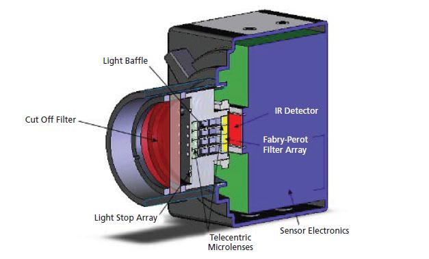 The imager's design incorporates a microelectromechanical system (MEMS) shadow mask technique to fabricate the Fabry-Perot etalon, which features multilayer dielectric mirrors. The filter array is integrated into a commercial handheld indium gallium arsenide (InGaAs) camera, where the standard imaging lens is replaced with a custom-designed 4×4 microlens array. This configuration allows for telecentric imaging performance across 16 sub-imaging channels, enhancing the system's versatility.