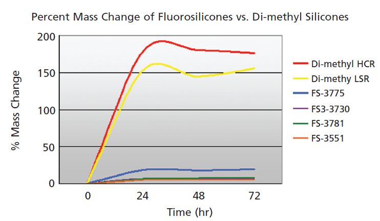 When exposed to JP8 fuel, the dimethyl LSR and HCR that were tested both swelled above 150% of their original size, while the fluorosilicone with the greatest swell, FS-3775, underwent a comparatively low 20% change in mass. FS-3511 performed the best out of all the fluorosilicone formulations, with 5% change in mass over 72 hours in JP8. FS-3781 swelled 7% throughout the soak, and FS3-3730 (100% Mol fluorosilicone) exhibited a sustained 6% swell, with outstanding mechanical performance after thermal aging.
