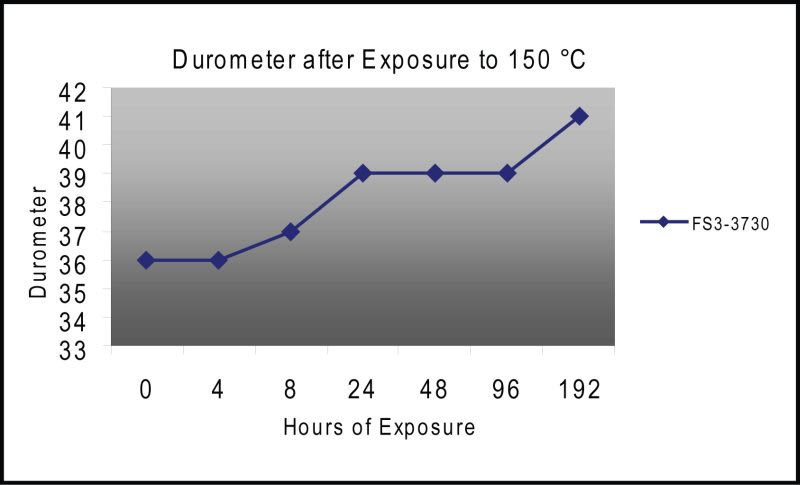After 192 hours at 150°C, FS3-3730’s durometer increased by 14%, while elongation, tensile and tear values did not exhibit significant trends.