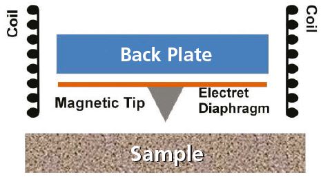 To address this issue, the authors introduce a novel probe called the electro-mechanical eddy current sensor (EMECS). This innovative design incorporates a sharpened magnetic tip attached to the membrane of an electret microphone. The magnet is actuated by an external coil using a low current AC voltage, which generates eddy currents in the conductive sample when the magnet is brought close to it. The interaction between the eddy currents and the magnet produces a damping force, allowing for improved spatial resolution.