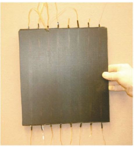 Experiments indicated that fuzzy fiber with high-density CNTs produced the best strain response, so sensors were developed accordingly for use in the composite specimens. The process of embedding sensors in a carbon composite panel required electrical isolation for the sensor. Instrumentation leads were bonded to the fiber tow with conductive epoxy and extended beyond the isolation layer. All composite specimens were fabricated through a similar process. Six composite panels, 12 × 12" , were fabricated with IM7/977-2 prepreg unidirectional carbon fiber tape. Three panels each were prepared with unidirectional or orthotropic layups. Sensors were embedded at specified levels in the layup depending on the type of specimen response to be tested. The figure shows a typical cured panel with embedded sensor elements prior to cutting into individual specimens.