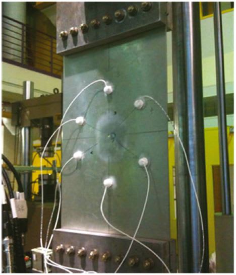An aluminum plate specimen was instrumented with an array of six piezoelectric discs and subjected to cyclic loading to investigate loading effects on guided wave propagation. A 6061 aluminum plate of 305 × 610 × 3.18 mm was machined to enable mounting in an MTS machine. The transducers were fabricated from 7-mm-diameter, 300-kHz, radialmode PZT discs that were attached to the plate with epoxy and further protected with a backing of bubble-filled epoxy.