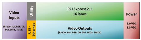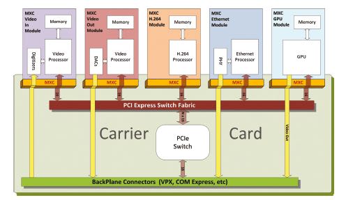 Video output data can be simultaneously compressed, encrypted and delivered through USB 3.0, PCIe or Ethernet 10/100/1G/10G connections. VPX carriers or baseboard-level systems using multiple MXC modules can communicate using 16 lanes of switched PCIe 2.1 or separate video interconnect busses, drastically reducing the effort required to interface video data sources that weren’t necessarily designed to talk to each other.