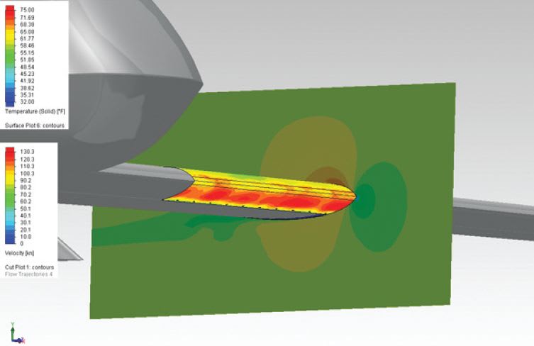 The first de-icing system involves placing electrical heating elements in the leading edge of the wing. These systems have been around since the 1940s, and they operate by heating up the surface above the melting point of the ice. Modeling this with the CADembedded CFD software was very simple. All that was needed was to split the surface to create the leading-edge zone where heat would be applied.