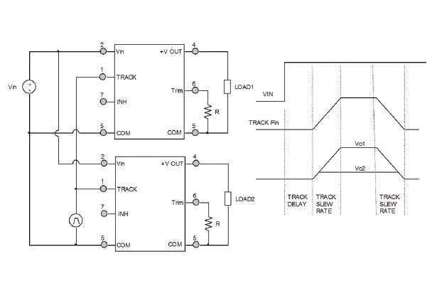 Many FPGAs require multiple voltages, such as one voltage to power the logic blocks and one or more voltages for the input/output sections. Often there are very strict requirements on the sequencing and rise and fall rate of the different voltages with respect to each other. Many POL converters have the functionality to meet these requirements. In the VPT POL converters, the track pin enables a great deal of flexibility for controlling the sequence of startup as well as the rate of rise and fall of multiple converters. Proper programming of the track pin allows coincident as well as ratio-metric rise and fall times between two or more POL converters. Figure 3 shows an example where an external signal is used to control the startup delay as well as the rise and fall times of two POL converters.