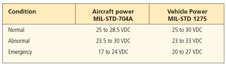 Input voltage conditions for tactical military applications cover electromagnetic compatibility and input levels. The former is spelled out in MIL-STD-461 which details the amount of conducted RF energy the device must be able to withstand and still operate properly. This is typically 40 dB or more of attenuation from the internal power supply switching frequencies all the way out to several megahertz. Commercially available filters that meet FCC requirements for commercial noise suppression cannot achieve this level of signal rejection. So each military power supply application must be approached individually to construct filters and maintain proper impedance matching characteristics to eliminate radiated noise at the input.