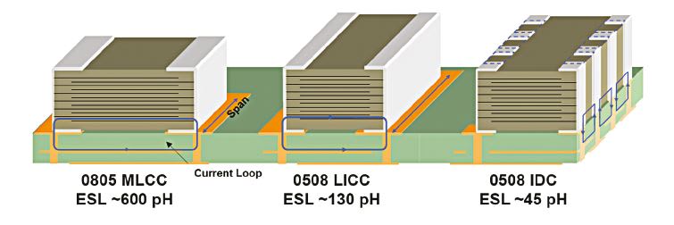 The closer to the core ASIC or programmable array, the more critical becomes the control of the ESL. As capacitors are two-terminal devices, the base ESL characteristic arises from the geometry of the part — the two terminals effectively define a current loop for the signal, and the larger the part, the larger the loop and hence the ESL. A basic way to counter this is to use a “reverse geometry” Low Inductance Chip Capacitor (LICC) that has the terminations on the sides, rather than the ends, of the parts. In a 2:1 aspect ratio part such as a 1206 size, using a reverse geometry version, 0612, will reduce inductance by a factor of 2 (typically from 1 nH to 500 pH) for the same capacitance/voltage design and the same amount of real estate.