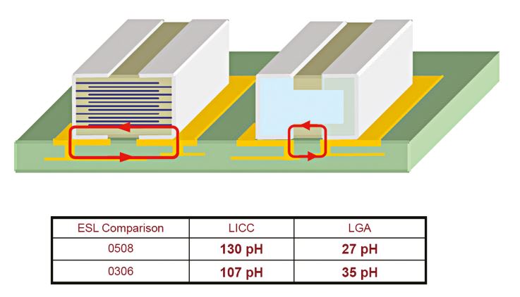 In order to minimize current loop, a new series of Land Grid Array (LGA) components has been developed having extremely tightly controlled termination dimensions. Using a vertical internal electrode system means that the average current loop between ports is extremely small and has the added advantage of minimizing ground plane coupling. These parts can achieve <30 pH for a 0.1 μF/4v for a small 0306 4.7 μF/6v device.