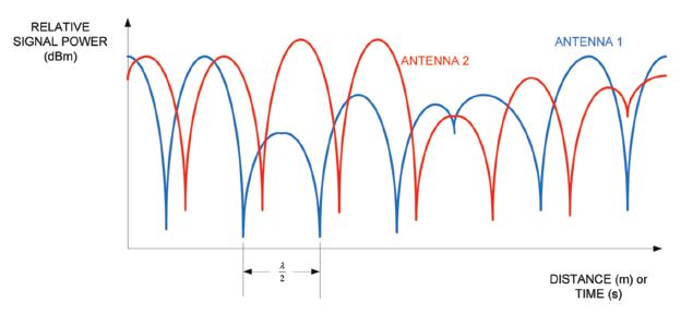 As mentioned previously, the effects of this localized and sudden attenuation can be compensated for by receiving the signal at two different receiver antenna placement locations and selecting the best antenna based on the signal strength or some other receiver performance measure. Figure 2 illustrates this by showing the signal strength at two different antenna placements over communication range and/or time. The signal strengths associated with the antennas are generally not correlated in time and/or space, and when one signal is in a null, the other can be found near a maximum and selected for communication.
