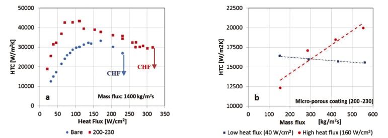 In short, coated heat sinks have higher heat transfer coefficients, lower wall superheat, and higher CHF than uncoated heat sinks. Moreover, temperature and pressure fluctuations (not presented) in the heat sink/evaporator are suppressed with the coated heat sinks, thus enabling accurate thermal control and isothermalization of high-power electronics and laser diodes.