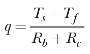 Here, Ts is the average temperature of the heat sink base, Tf is the average fluid temperature (average of the inlet and outlet temperatures) and Rb and Rc are the thermal resistances of the copper base and channel. Notably, Rb = thickness of the base/thermal conductivity of copper and: