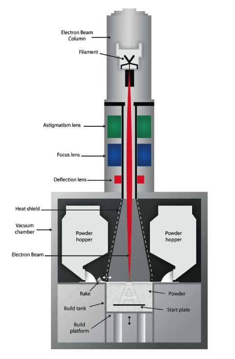 During CalRAM’s manufacturing process, electron beam paths are defined by proprietary software that “slices” existing 3-D design models into a series of separate layers, much like the views in a modern CAT scan. Powder is spread on the “start plate” by a traversing rake in the build chamber and then sintered to the plate using heat from the electron beam.