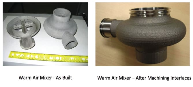 Iso grid and lattice block structures are actually cheaper to manufacture than less complex designs because they use less material and therefore take less time to produce. In one example, the company built a warm air mixer for Northrop Grumman’s unmanned combat aerial system that is being developed for the U.S. Navy. The layer-built component resulted in part count reduction and elimination of post-production assembly costs and time while still being able to meet all of the engineering design requirements.