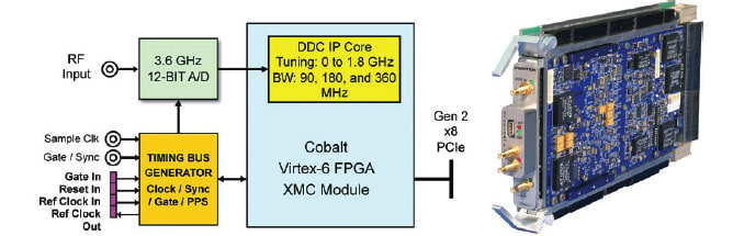 One product example is the Pentek 71641 3.6-GHz A/D and Digital Down Converter (DDC) XMC module. It features a 12-bit 3.6-GSample/sec A/D converter coupled to a Virtex-6 FPGA. The A/D de-interleaves samples into eight parallel 12-bit streams, delivering samples to the LVDS ports of the FPGA at 450 MSamples/sec each. Inside, eight parallel engines implement a DDC that tunes across the 1.8 GHz input band (Figure 1). It performs frequency translation to baseband and provides digital filtering of the complex baseband output samples. Selectable output bandwidths of 90, 180, or 360 MHz, representing tunable slices of the input spectrum, are delivered to the system through a native PCIe Gen 2 x 8 interface.