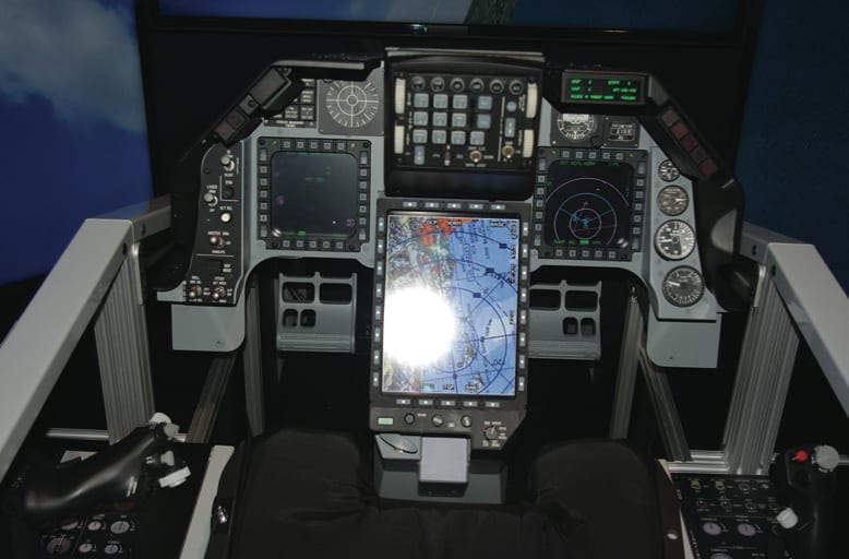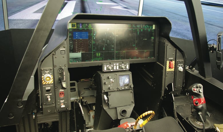 Compared to most fourth-generation fighters, where every available space is taken up with added-on display panels and switches, the F-35 “office” looks empty. One reason for this is the single panoramic cockpit display in front of the pilot, offering 20 x 8 inches of touchscreen. This widescreen display, supplied by L-3, is comprised of two side-by-side units that have aircraft state information across the top strip while below are four changeable display groups that have all the tactical and mission information in a format selected by the pilot.