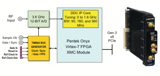 As a product example, the Pentek 71741 3.6 GHz A/D and DDC XMC module is shown in Figure 1. It features a 12-bit, 3.6 GSample/sec A/D converter coupled to a Virtex-7 FPGA. The A/D de-interleaves samples into eight parallel 12-bit streams, delivering samples to the LVDS ports of the FPGA at 450 MSamples/sec each. Inside, eight parallel engines implement a DDC (digital down converter) that tunes across the 1.8-GHz input band. It performs frequency translation to baseband and provides digital filtering of the complex baseband output samples. Selectable output bandwidths of 90, 180, or 360 MHz, representing tunable slices of the input spectrum, are delivered to the system through a native PCIe Gen 3 x8 interface.