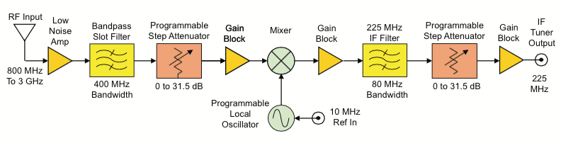 In the slot receiver shown in Figure 2, an input band pass filter rejects signals outside of the defined RF tuning “slot,” helping to eliminate both out-of-band noise and discrete signal interferers. The mixer and tunable local oscillator translate the RF input down to an IF frequency of 225 MHz. An IF bandpass filter excludes all signals outside an 80-MHz band centered at 225 MHz, delivering an analog output suitable for 14- or 16-bit A/D converters.