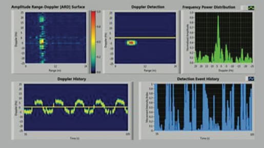 Figure 2 shows the detection results for scenario 1, where a person is walking back and forth. The LabVIEW front panel presents the instant Doppler surface results (upper left), determined target (upper middle), spectrum of the target range bin (upper right), Doppler record showing a 60-minute detection history (bottom left), and target intensity index record (bottom right). The threshold is applied on the target intensity index, so when a detected signal exceeds a certain level, the system will treat the current detection as a valid target. The Doppler record graph (bottom left) shows clear positive and negative Doppler shifts, which correspond to forward and backward walking directions.