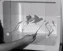 Lentink calls his device an aerodynamic force platform, and it works very similarly to the force platforms that have allowed bioengineers to study the forces that humans exert to walk or run. It's a box the size and shape of a large birdcage, with an acrylic observation window and two bird perches inside. Supersensitive force sensors are attached to the bottom of the box. This force transfer is based on Newton's third law of motion, which states that for every action there is an equal and opposite reaction. As the bird flies perch-to-perch, each beat of its wings pushes against the air, which in turn pushes against the bottom of the box and also sucks down the ceiling slightly. These forces are recorded to produce a precise measurement for each stroke of the bird's wings.