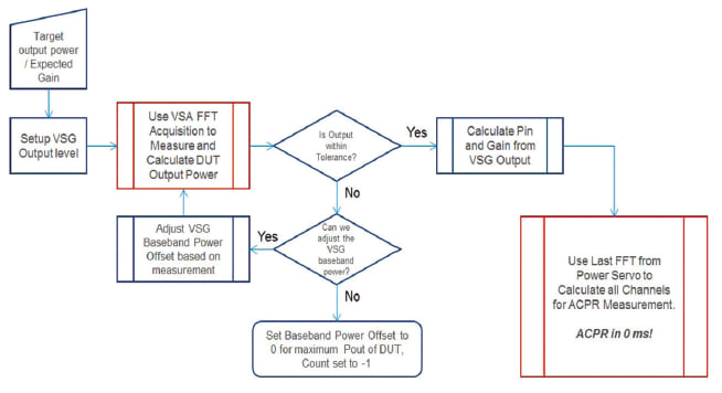 - Power Acquisition for Servo and ACPR. This method produces fast results by using the same power acquisition mode for both the servo and ACPR measurement. First, it’s used for the servo loop, which normally converges between 2 and 3 steps. Once it converges, the input power and gain are measured. Next, the ACPR is measured. This is performed 4 to 6 times to measure the 2 or 3 adjacent channels.