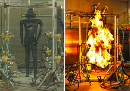 Midscale and manikin flash flame tests were conducted. Special garments were constructed for testing on the thermal manikin (Figure 1). The UHMWPE materials were fabricated into undergarments consisting of shorts and a vest. An outer layer of FR material was fabricated into a coverall worn over the UHMWPE undergarments. The midscale flash flame tests were used for preliminary testing during design and fabrication of prototype garments with UHMWPE materials and FR fabrics. These tests helped guide the choice of materials and fabrics by showing the response of the material configurations as they were exposed to increasing durations of flash flame.