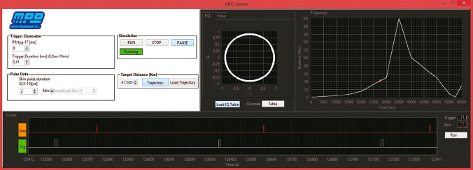 The system features a LabVIEW interface that manages the simulation and can configure the pulse stream (pulse width and PRI – Pulse Repetition Interval) and the configuration of the trigger generator (if there is no way to access the radar trigger). The pulse is fully characterized by loading an I/Q data table that is then processed by the I/Q modulator; the software interface will also show the modulation in the time domain. The operator can choose between a static or dynamic object, and can load a customizable trajectory to run.