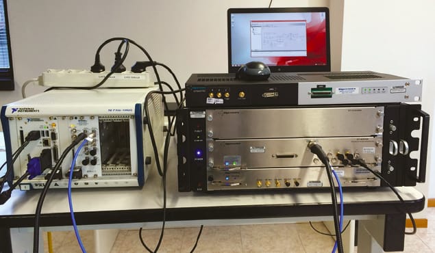 Mp>To achieve this target, the system uses an NI PXIe-5646R vector signal transceiver (VST) from National Instruments (Austin, TX) to generate and process signals in the intermediate frequency (IF) band. The modulated signals are then sent to a range extender that executes up-conversion of the IF signal at higher frequencies, manages the frequency agility, and controls the phase coherency if required (for example, in beam forming applications). The range extender also has the task of generating a reference frequency at 1200 MHz characterized by extremely low phase noise. The VST modulates it and sends it back to the range extender.