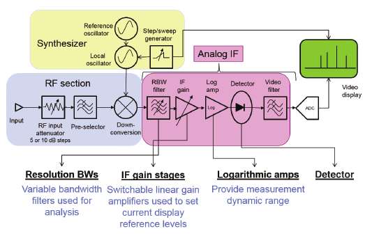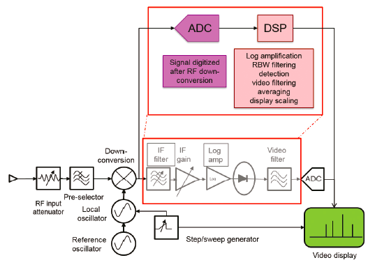 It is important to understand the differences between analog and digital IF architectures. Figure 1 features a basic diagram of a traditional superheterodyne receiver with an analog IF section. The RF section accepts input signals over the specified instrument frequency range, and uses the frequences generated by the local oscillator (LO) to downconvert (or mix) these input signals to an IF. Input frequency ranges can cover up to 40 GHz or higher, whereas IF frequencies tend to be hundreds of megahertz. Downconverting the input signals to a lower single frequency makes it easier and less expensive to develop circuits used to digitize and further analyze the input signals.