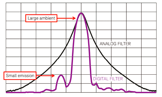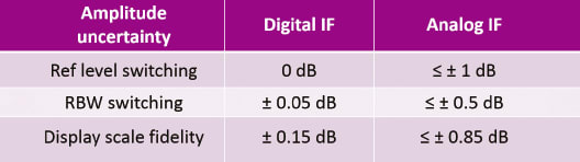 Digitally implemented RBWs offer both improved switching accuracy and improved filter performance. Analog RBWs require IF gain adjustments to correct for amplitude differences between filter stages. This correction results in RBW switching uncertainty of several tenths of a decibel. Digitally implemented RBW switching uncertainty can be less than .05 dB. This is important when making compliance measurements because these measurements are made using CISPR or MIL STD bandwidths, which are different than the RBW used for calibration.