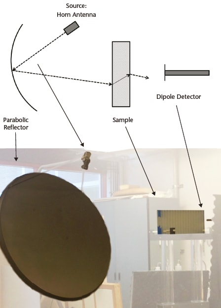 Simulation modeled the material using a full-wave adaptive solution for the 1-12 GHz frequency band with an incidence angle between 0 and 90 degrees. Experiments are underway with a three-layer sample consisting of an array of hollow glass tubes in a Rexolite matrix. Thicker samples may be tested through the addition of extra layers. The sample is placed in a polycarbonate-fiberglass test fixture that is adjusted for the desired angles of incidence. A 3D scanning robot scans the desired test volume, and the vector analyzer (VNA) sends and receives the field response in the form of S- parameters for the 7-12 GHz frequency band (see figure).