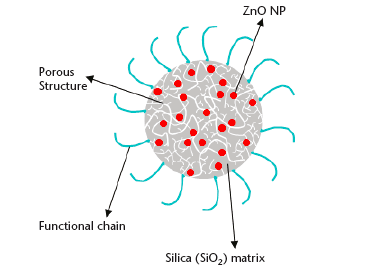 Reactive and multifunctional porous metal oxide-silica composite nanoparticles (ZnO-SiO2 nanoparticles) were developed for efficient destruction or neutralization of targeted biomolecules (chemical warfare agents, bio-agents, and other toxics) by aero-oxidation, electro-oxidation, or photo-catalytic oxidation. In the composite nanoparticles, metal oxides crosslink surfactant or polymer into core-shell micellar composite nanoparticles. The surface of the porous silica is covalently bonded with an organic functional group through silane chemistry.