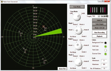 Today’s radars need rigorous testing before they are deployed in military or civil aviation. An automated test equipment (ATE) system was developed using NI PXI modular instruments from National Instruments (Austin, TX) to facilitate the functionality tests of the radar and physical parameters test of the receiver (Rx) and transmitter (Tx), including Rx bandwidth, Rx sensitivity, Tx power, and Tx pulse parameters. Functionality tests included a target simulator to the radar at 1090 MHz, video signal detection, and radar scan converter display using synthetic transistor-transistor logic (TTL) video signal and LAN communication. Reply pulses in the target and multitarget simulators were stationary and trajectory motion.