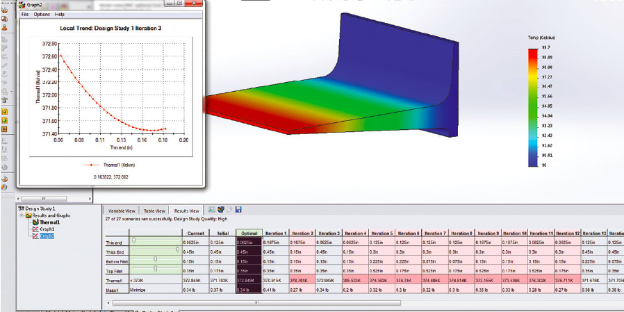 Through the careful application of these new tools and analyzing a large “Design of Experiments” suite of design scenarios, these sophisticated software tools streamline the task of determining the fin geometry best suited for a specific application environment in the fewest number of iterations. It is still always wise to verify these fin design parameters in the final CFD analysis. There are graphs that show the relative heat dissipated from the processor when various fin parameters are plotted (thinner vs. thicker; fin spacing) and which direction the design should take next.