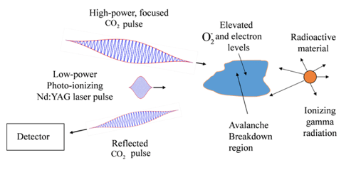 The proposed remote radiation detection method is not the first, but it has advantages over other approaches. For example, terahertz radiation has also been proposed as a way to breakdown air in the vicinity of radioactive materials, but producing terahertz radiation requires complicated and costly equipment. Another proposed method would use a high-power infrared laser to both strip electrons and break down the air, but the method requires the detector be located in the opposite direction of the laser, which would make it impractical to create a single, mobile device.