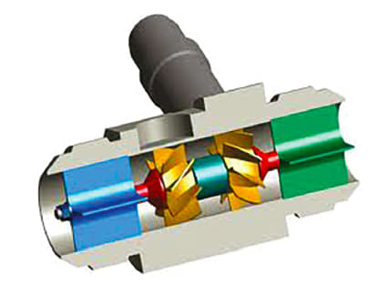 Dual-Rotor Design: Turbine flow meters have traditionally offered a repeatable flow range of approximately 100:1 and a maximum linear flow range of 30:1. This performance is adequate for general-purpose applications, but may not be suitable for aerospace users. The dual-rotor turbine design extends the lower flow range far below what has been possible before. These meters have a wider turndown than single-rotor configurations, and offer a repeatable flow range up to 500:1 and a universal viscosity curve (UVC) turndown range of 60:1 (Figure 2).