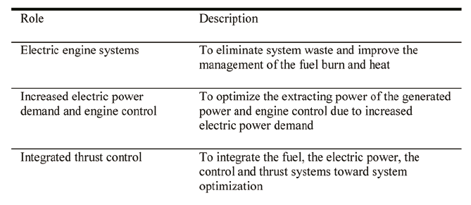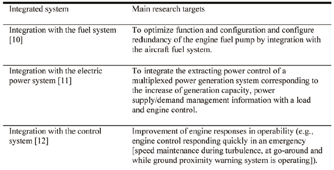 It is theorized that systems and equipment for an All Electric Aircraft (AEA) will be developed 20 years hence as a More-Electric Aircraft (MEA) with no bleed system, which is a concept typified by the Boeing 787, and electric powered propulsion (including electric distributed thrust or electric hybrids by gas turbine power generation), which is expected to be realized after the 2040s. In this trend, a More-Electric Engine (MEE) plays the roles shown in Table 1.