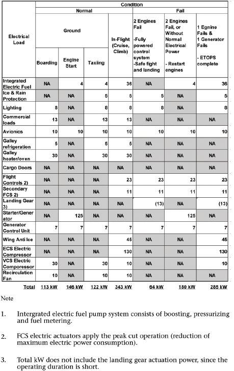Electric power is supplied to the communication system, the attitude indicator, the attitude control system, the lighting, the fuel pumps and anti-icing systems so that normal operation is available with one engine. Table 4 shows the calculated result of the necessary electric power of a single aisle aircraft with 180 seats based on the above conditions. Power demand for each electrical load was estimated assuming the 180-seater AEA system.