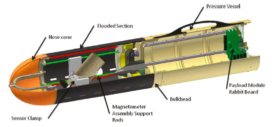 The magnetometer module design schematic is presented in Figure 2. The module flooded section houses the G-880AUV total field magnetometer. The sealed pressure vessel contains the G-880AUV electronics and Applied Physics 539 fluxgate compass (fluxgate). The sensors are interfaced with the magnetometer module circuitry, which is necessary to provide internal electrical power and communication with the vehicle’s control system through the AUV microcontroller “rabbit board.” A relief slot cut in the flooded section is used to facilitate G-880AUV sensor orientation requirements.