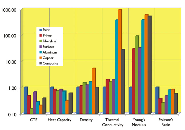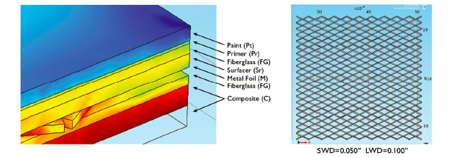 In the surface protection scheme shown at left in Figure 2, each layer including the paint, primer, corrosion isolation layer, surfacer, EMF, and the underlying composite structure contribute to the buildup of mechanical stress in the protective coatings over time as they are subject to thermal cycling. The geometry in the figure is from the coefficient of thermal expansion (CTE) model developed by Robert Greegor2,3 and his colleagues using COMSOL Multiphysics® in order to evaluate the thermal stress and displacement in each layer of a one-inch square sample of the composite structure layup.