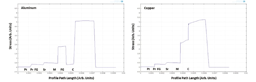 Through the paint layer at the top of Figure 4, it is possible to observe the displacement pattern of the underlying EMF. The magnified cross-sectional view clearly shows the variations in displacement above the mesh and voids in addition to the trend in stress reduction in the uppermost protective layers. Figure 5 shows the relative stress for each layer in surface protective schemes that incorporate either copper or aluminum EMF. The fiberglass corrosion isolation layer required by the aluminum EMF acts as a buffer, causing the stress to be lower in the aluminum than it is in the copper EMF.