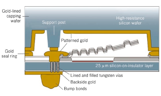 MEMS switches have historically had to deal with contamination. The CMEMS single-crystal silicon cover is strong and is the ultimate gas diffusion barrier protecting the device from contamination. It is designed to protect each switch but at the same time, it enhances the RF properties of the switch. The cover, an intrinsic component of the CMEMS circuit, provides for a very low RF loss and tight confinement of the RF signal.