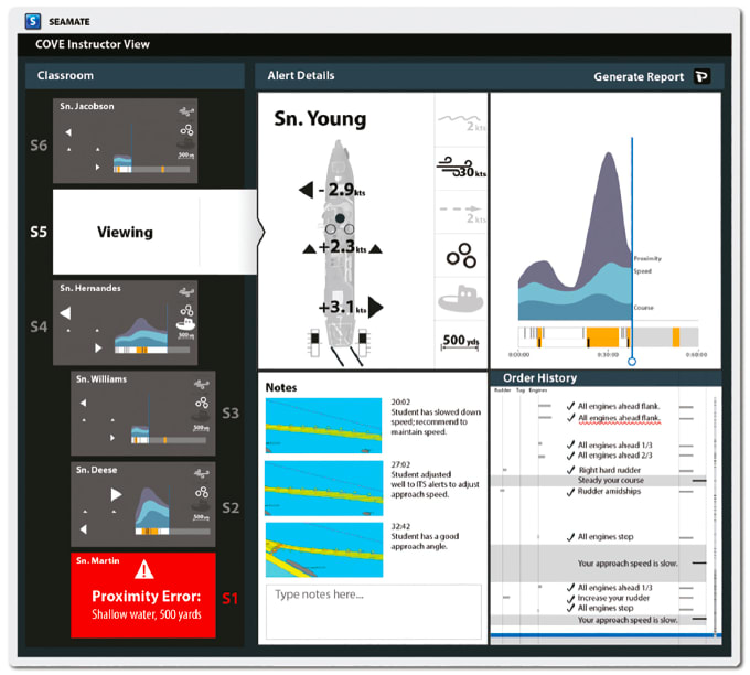 While they significantly reduce the need for costly live training at sea, virtual shiphandling trainers such as the Navy’s Conning Officer Virtual Environment (COVE) depend heavily upon expert mariners, with individual instructors typically working with only a single active student at a time. With the limited number of available expert mariners, this one-on-one training requirement makes it difficult to realize the full benefit of virtual training systems. Emerging automation technologies, such as Intelligent Tutoring Systems (ITS), will offload many manual instructor tasks, but introduce new supervisory challenges for instructors monitoring multiple students simultaneously. Charles River is developing SEAMATE to more efficiently meet these new training demands, enhancing the overall efficacy and scalability of COVE training.